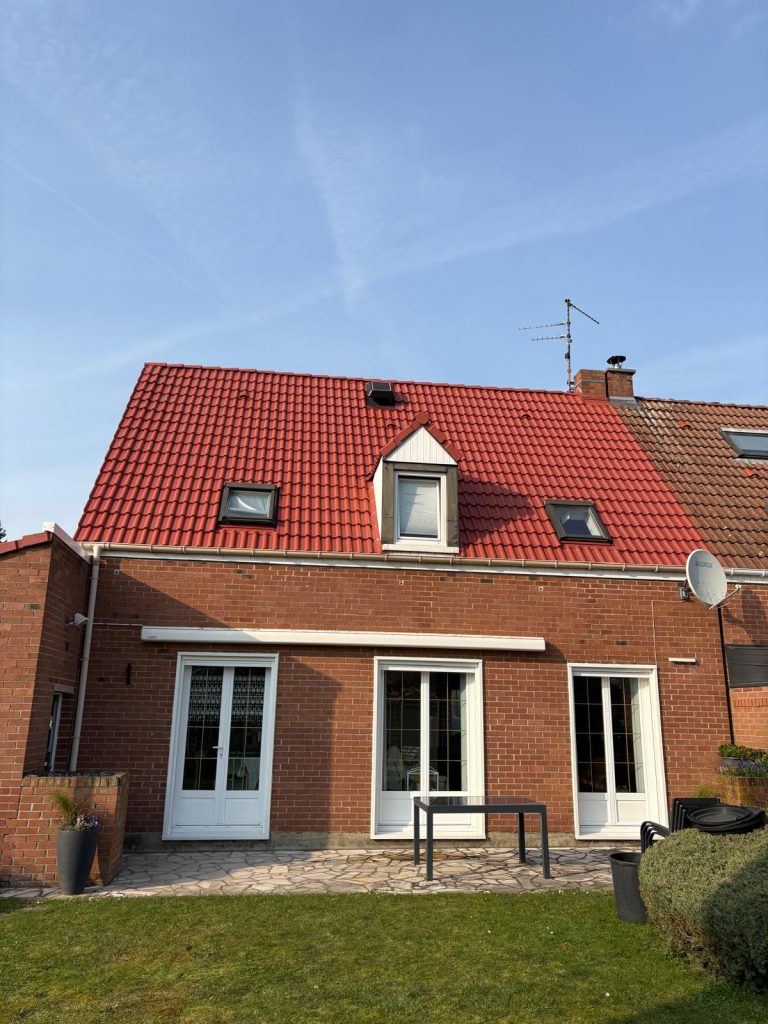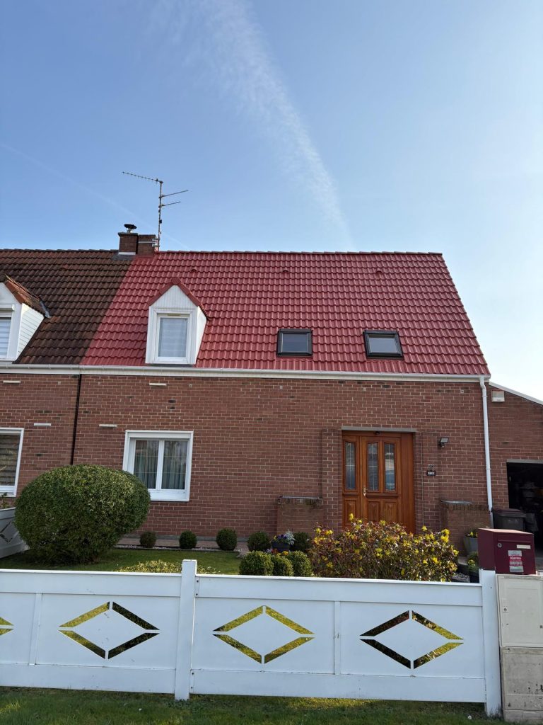 Récemment, nous sommes intervenus pour l’entretien complet d’une toiture en tuiles terre cuite rouge à Douai, dont l’état nécessitait une remise en protection durable. L’objectif était clair : assainir la surface, renforcer les matériaux et prolonger la durée de vie de la couverture.
